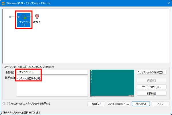 VMware Wordstationのフリー版では出来なかったスナップショットを作成できるようになった。画像はOSインストール直後でスナップショットを作成したところ